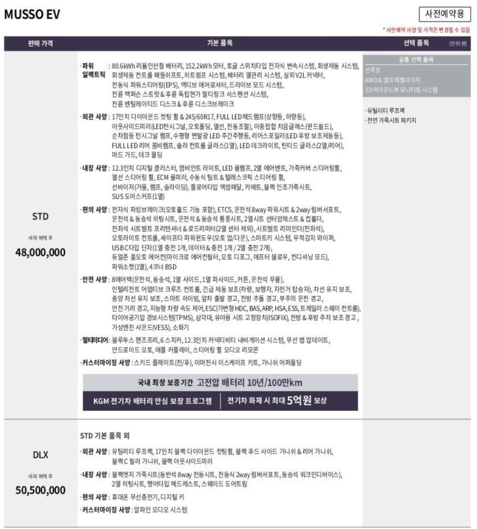 무쏘 EV 스탠다드가 3410만원, 디럭스가 3635만원으로 이렇게 비교해 보신다면 용도에 따라서 무쏘 EV가 좀 더 좋은 선택이 될 수 있겠죠?