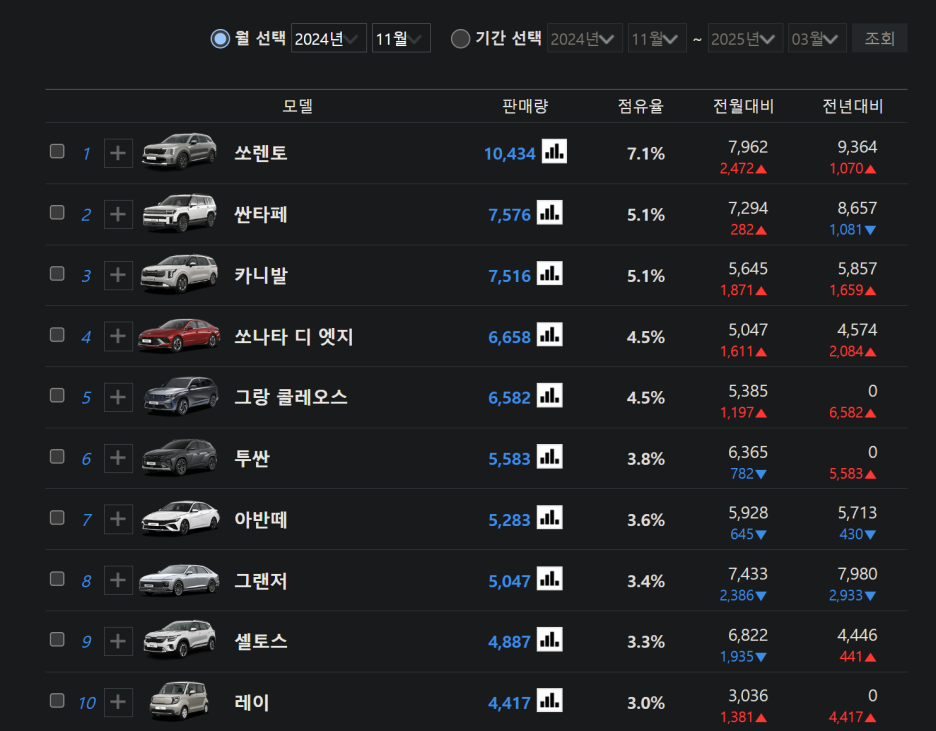 가장 높은 판매량을 자랑하는 쏘렌토와 싼타페에 맞먹을 정도로 판매가 되고 있으며, 이런 기세는 현재까지 이어지고 있습니다.