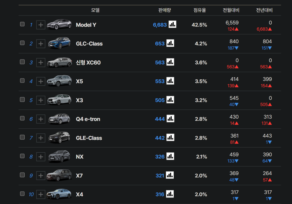 천대를 넘는 차량은 모델Y와 씨라이언7이 유일합니다. 모델Y는 국내에서 가장 많은 판매량을 자랑하는 쏘렌토, 카니발, 그랜저 판매량에 접근하면서 핵폭풍에 비유될 수준이며, 씨라이언은 중국차임에 불구하고 1500대라면 구매자에게 내구성이 검증이 끝난다면 다음 버전은 수입차 중에서 TOP5에 들어서는 것은 시간문제로 보입니다.