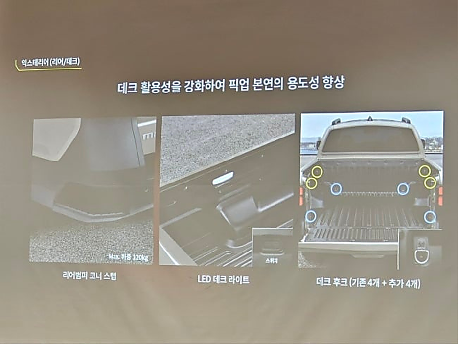 픽업트럭만에 커다란 트렁크에는 KGM 로고가 제공되며, 손잡이 부분은 안쪽으로 누르면 전자식 스위치가 제공됩니다.