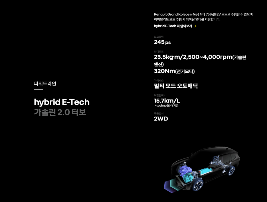 다만 르노 하이브리드는 전기차에 가까운 하이브리드라는 점에서 전기 모터의 출력이 보다 중요하겠죠?